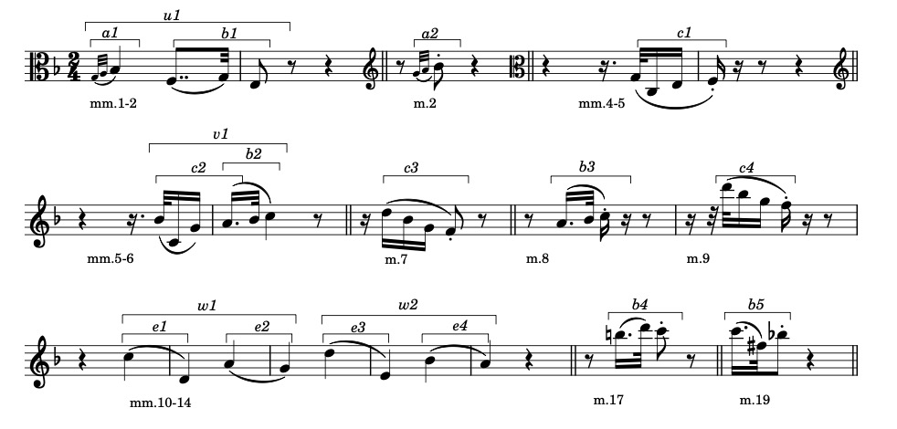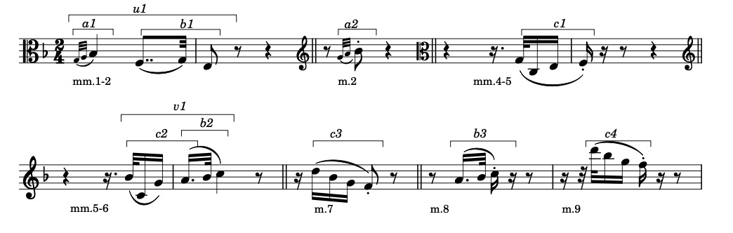 Figure 2 shows the motives of the first phrase. There are three basic motifs with their variants: a, b and c. They are put together in various combinations to form composite motifs like u and v.