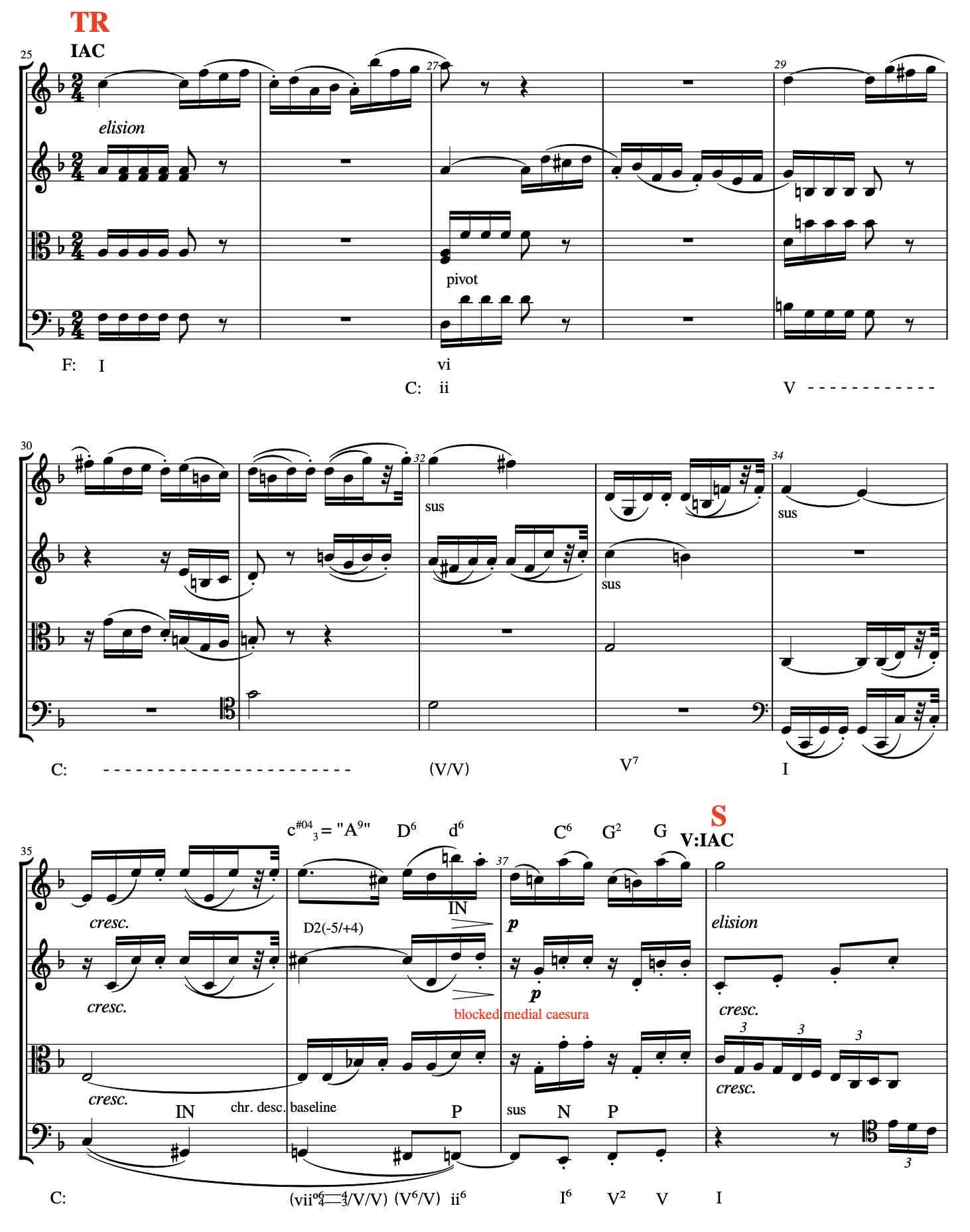 And now for the transition to the secondary theme (S). A “normal” procedure would be an arrival on either a half cadence in C major (V:HC) or (less common) a half cadence in F major (I:HC), followed by a break or caesura in all voices, the so called medial caesura (MC). [9]Hepokoski & Darcy mention these cadences as the first and second level default for ending a transition: Hepokoski & Darcy Elements of Sonata Theory, 25-26.