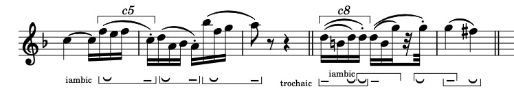 At a higher level (grouping two notes together) there is a iambic organization ending with a note from the tonic triad. This is shown in the second row beneath the stave. Still one level higher (grouping four notes together) there is again a iambic organization which corresponds to a leading tone – tonic progression.