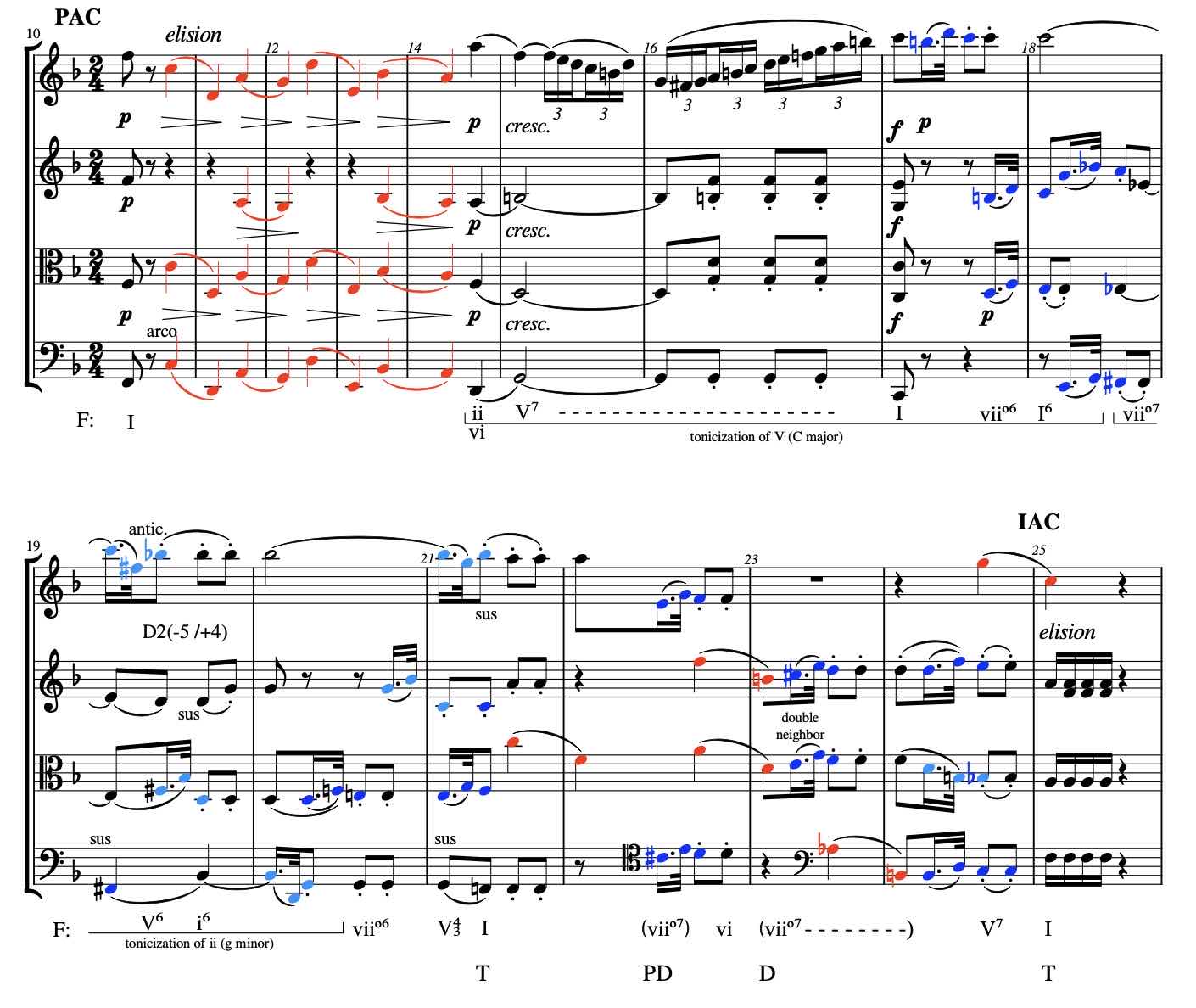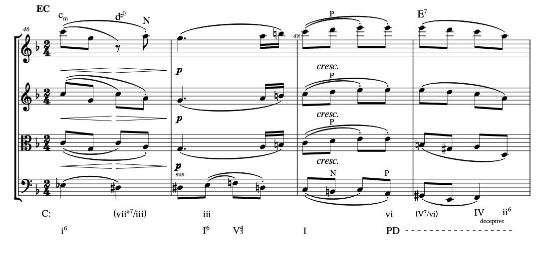The harmonic structure is also the same, except for the end of course. The first of these phrases (mm.6sb-8fb) ends with an evaded cadence (EC) on the first beat of m.8; this comes as a surprise, one expects an F natural in the viola but it is an A natural. This creates a tension and an expectation to resolve it. The second phrase (mm.8sb-10fb) does this with the proper closure (PAC) in mm.9-10.