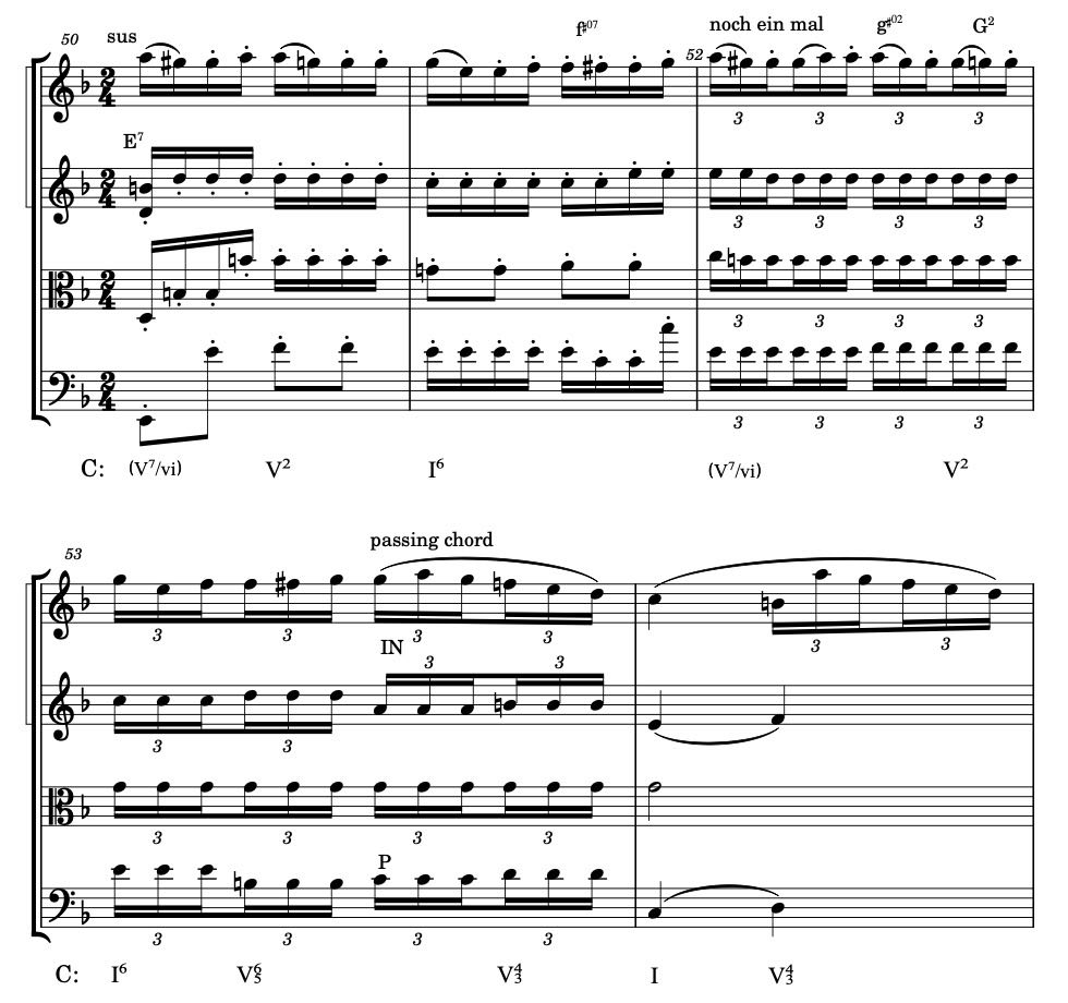 In m.50 and m.52 we find the V7/vi on the first beat and the chordal fill on the second beat and here it is a V2 version of the correct dominant. The V2 – I6 progression is of course very common, supported by the descending bass from the fourth to the third scale degree.