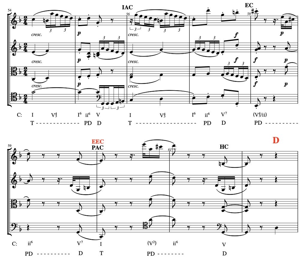 There are two things that stand out; first of all the dynamics: here it is suddenly (subito) piano and secondly the motivic material comes from the primary theme (P) (motive c1, fig.2). It leads to a dominant – tonic progression and finally we find an authentic cadence (IAC, mm.59-60). One could argue that this is a perfect authentic cadence (PAC) because the main voice here is the second violin and that ends on a C natural. So here is finally the end of the secondary theme (S) and the cadence in mm.59-60 is at the same time the EEC.