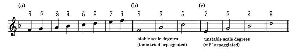 All scale degrees have different functions (and names) in the scale. A fundamental distinction can be made between the three stable scale degrees that form together the tonal triad (fig.4b) and the four other scale degrees that are less stable and tend towards one of the stable tones of the scale. This is perhaps most evident in the seventh scale degree (the leading tone), which strongly tends towards the tonic. Notice that these four notes form the viiø7 diatonic half diminished seventh chord (fig.4c).