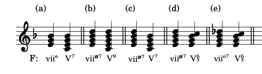If one starts with the viiø7 in stead of the vii0 chord adding the dominant results in a dominant ninth chord as shown in fig.5b. Figures 5c and d show the resulting chords in various positions if the dominant is not added but replaces the seventh in the viiø7 chord. Figure 5e shows the progression when one starts with the fully diminished chord on the seventh scale degree (a chord that is proper to the harmonic minor scale) and then replaces the seventh with the dominant. This is only a step of a semi tone in the soprano with three common tones in the other voices. The resulting dominant seventh chord is not in root position however as is the case in example 5d.