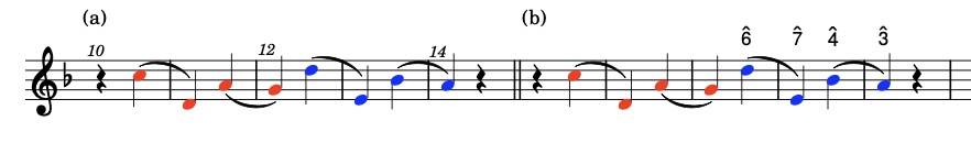 The theme can be divided in two phrases of 4 notes each as shown by the colours. The phrases are the same, except that the second phrase (blue) is a second higher than the first (red). Starting with the second phrase one can see that the first three notes come from the set of unstable scale degrees or, to put it another way, they come from the viiø7 chord (talking F major here). Not all the notes of the viiø7 chord are there; the second scale degree (the G natural) is missing. This is shown in fig.6b. Notice the quite dramatic fall of a minor seventh which is then more or less filled up with the fourth and third scale degree. Leonard B. Meyer would call this a Gap-fill melody.[4]Leonard B. Meyer, Explaining Music: Essays and Explorations (Berkeley [etc.]: University of California Press, 1973), 145.