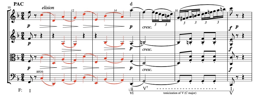 More technically speaking, the first utterance of the viola with the reply of the first violin (mm.1-2) might be called a basic idea and mm.3-4 the repetition thereof. Together they form the presentation of a sentence structure. The following six measures (m.4sb – m.10fb) can than be seen as the continuation of the sentence, which ends with a perfect authentic cadence (I:PAC) in F major, the home key of the movement and the quartet as a whole. The default ratios in a sentence are 1:1:2, so in that case the continuation has the same length as the presentation. Here we find a continuation that is six measures long where we expect four measures and on top of that the continuation introduces new rhetoric material and is therefore contrasting.