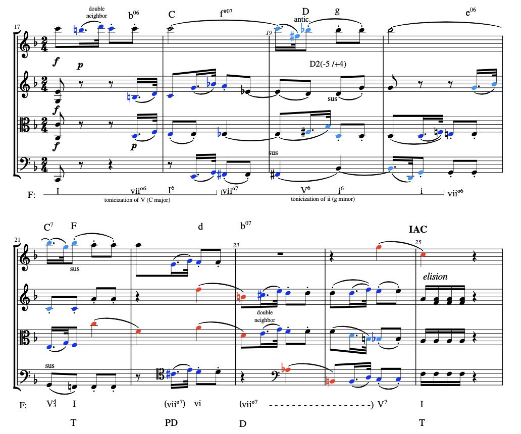 Looking ahead at m.21 we find an arrival on an F major chord following a contrapuntal cadential progression. This already makes the listener doubt whether there has been a modulation to C major. But after hearing the confirmation with a full cadential progression and the imperfect authentic cadence (I:IAC) in mm.22-25 it is clear that we are still firmly rooted in F major. So in retrospect all this material belongs to the primary theme (P) and I would like to name mm.10-25 in accordance with Hepokoski & Darcy P2. [3]Hepokoski, James A, and Warren Darcy, Elements of Sonata Theory: Norms, Types, and Deformations in the Late-Eighteenth-Century Sonata (New York [etc.]: Oxford University Press, 2006), 71.