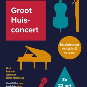 Groot Huisconcert Abcoude Gathering of musicians from Abcoude who play their favourite pieces ... 22 Mar 15:00 - 17:30 Muziekschuur AbcoudeKerkplein 33, Abcoude, Netherlands