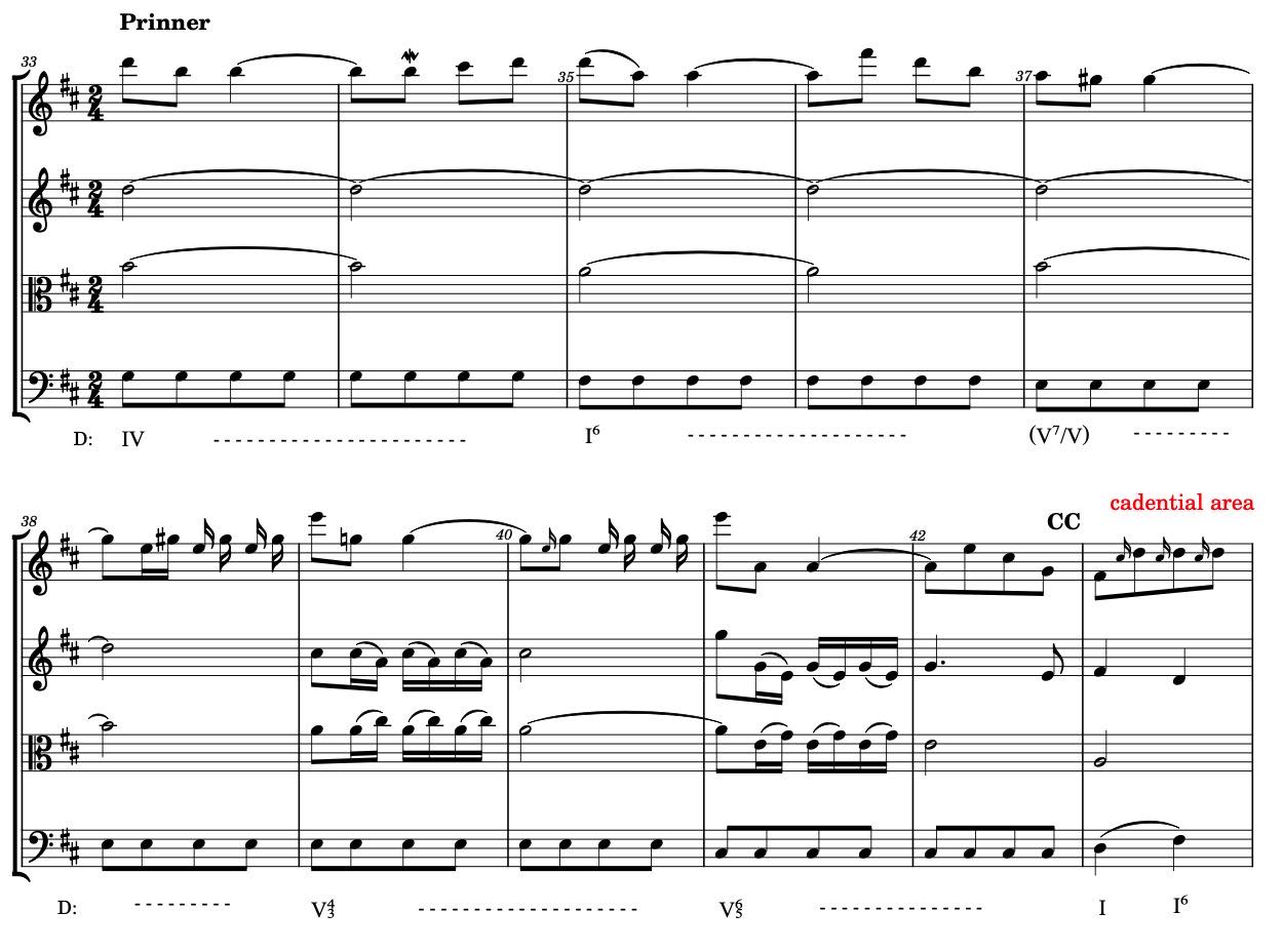 Figure 6a shows the Prinner as cited by Gjerdingen from Johann Jacob Prinner.[20]Gjerdingen, Music in the Galant Style, 46. Clearly recognisable is the stepwise descending bass and the parallel tenth in the soprano. Figure 6b shows a Prinner with an added seventh scale degree just before the final tonic. And finally figure 6c shows the phrase as Haydn wrote it in the string quartet under consideration. Note that I have combined the two bars of the motive into one bar. In mm.37-38 Haydn inserts a chromatic passing note in the soprano (the G-sharp) which leads to an applied dominant of V instead of the ii in the other examples. A raised third in the ii of a major key becomes an applied dominant of V of that key.